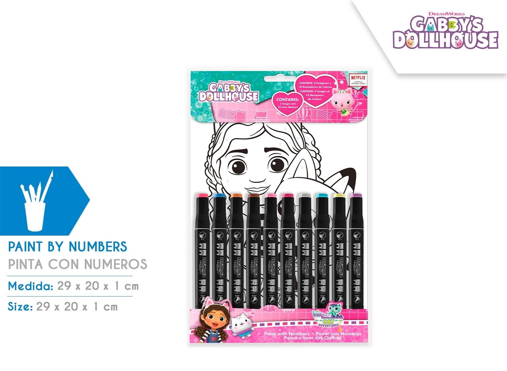 Zestaw kreatywny Gabby's Dollhouse to bogaty zestaw do kreatywnej zabawy dla dziecka.10 dwustronnych flamastrówWymiary: 29x23x1 cmMateriał: PVC, papierZawartość : 2 kartki do rysowania po numerkach číst celé