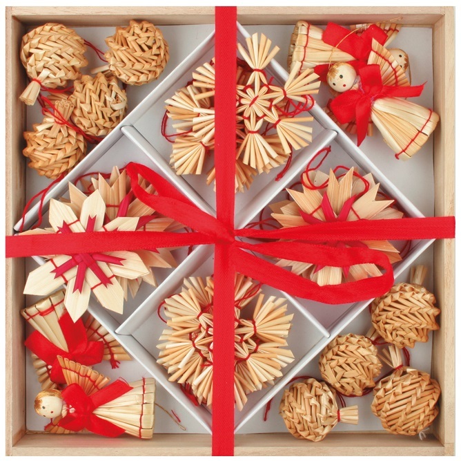 Tento set obsahuje 32 kusů slaměných ozdob v různých motivových variacích, uložených v elegantní dřevěné krabičce. Díky tenké šňůrce jsou dekorace připraveny k okamžitému zavěšení - ať už na vánoční stromeček, věnec, nebo i do okenního rámu. Slaměné ozdoby přinášejí do vašeho interiéru přírodní doplněk, který nikdy neztratí na kráse a půvabu.