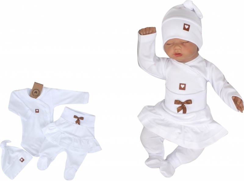 Soupravička obsahuje body s praktickým zapínáním na boku, polodupačky s volánkem a jemnou čepičku. Vše je vyrobeno z 100% kvalitní bavlny, která je šetrná k citlivé pokožce miminka a zaručuje pohodlí po celý den. Díky preciznímu zpracování materiálu i střihu je oblečení pružné a zachovává si tvar i po častém praní.