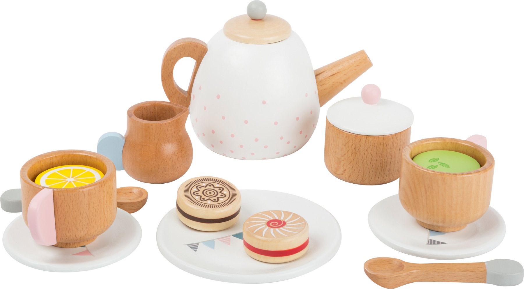 Čajový set od německé značky Small Foot je ideální volbou pro malé milovníky hraček, kteří si rádi hrají na opravdový čajový dýchánek. Vyrobený z masivního dřeva, nabízí vše potřebné pro hraní na dvě osoby - různé druhy čaje, mléčnou pěnu, sušenky a praktické doplňky jako dvě lžíce na míchání. Víčka konvice a nádoby na cukr jsou odnímatelná, což přidává na reálnosti a umožňuje dětem rozvíjet jemnou motoriku.