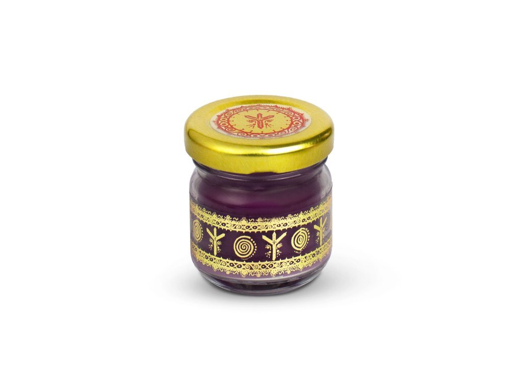 Vonná MINI ochranná svíčka s vůní černé lilie z přírodního sójového vosku se zlatou ochrannou runou ALGIZ. číst celé