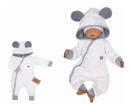 Z&Z Velurový kojenecký overálek s kapucí a oušky - bílo,šedý, vel. 62; 62 (2-3m)