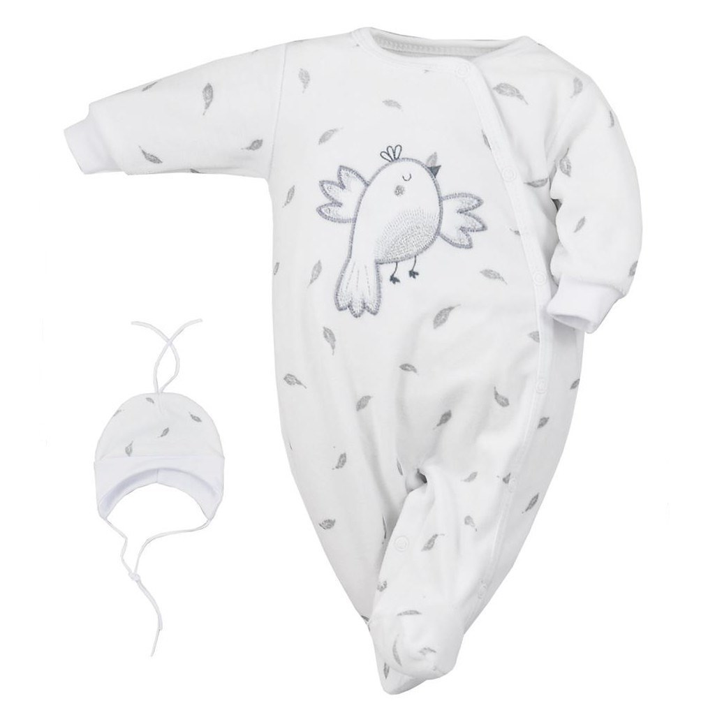 Semiškový kojenecký overálek s čepičkou Koala Pírka. Overálek má moderní boční zapínání na cvočky po celé délce a mezi nožičkami. Overal je zdoben moderními pírky a roztomilým obrázkem ptáčka. Čepička se zavazováním na tkaničky krásně kryje ouška a je celopotištěná pírky. Soupravička s moderním...