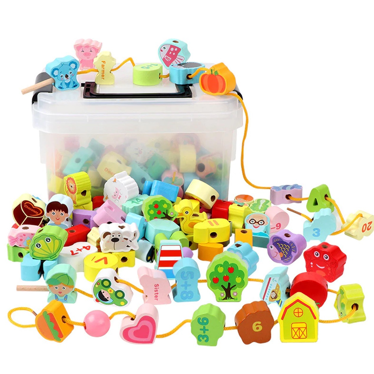 Pestrobarevný herní didaktický set plný dřevěných navlékacích korálků s obrázky a čísly pro snadné počítání. Rozmanité korálky přilákají pozornost malých i velkých dětí, zaujmou na první pohled. Na jednotlivých korálcích naleznete vyobrazená zvířátka, podmořské tvory, dopravní prostředky i...