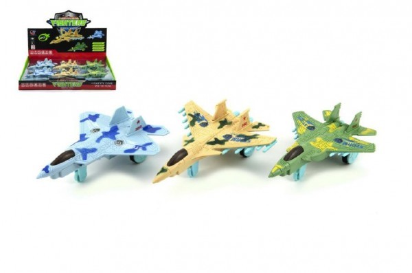 Letadlo/stíhačka plast 18cm na baterie se světlem se zvukem asst 3 barvy na setrvačník 6ks v boxu