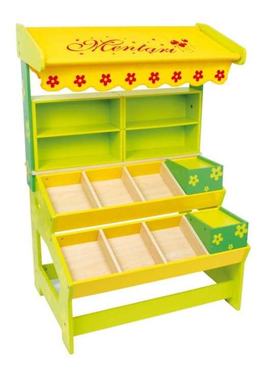 Módní barevný lakovaný prodejní stojanu z masivní překližky. Textilní markýza s červenými květy. Německá firma Legler zaměřená na výrobu kvalitních dřevěných hraček od roku 1996. Všechny dřevěné hračky značky small foot mají označení CE a jsou vyráběny dle evropské normy pro bezpečnost hraček EN...