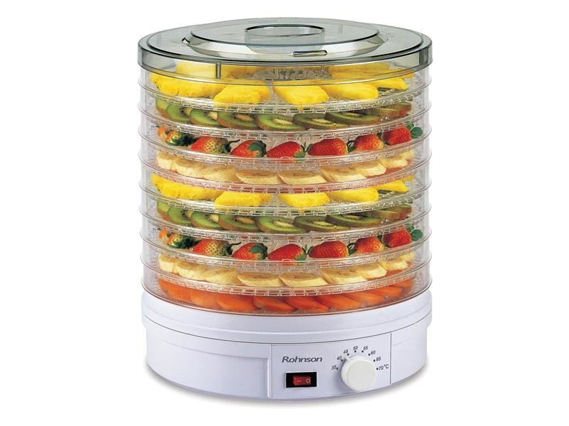 Sušička potravin ROHNSON R-283 obsahuje celkem 9 plat. Ideální pro sušení ovoce, zeleniny, bylinek, hub a masa. Plynulá regulace nastavení teploty sušení od 35 do 70 °C. Integrovaný ventilátor pro rovnoměrné sušení.
