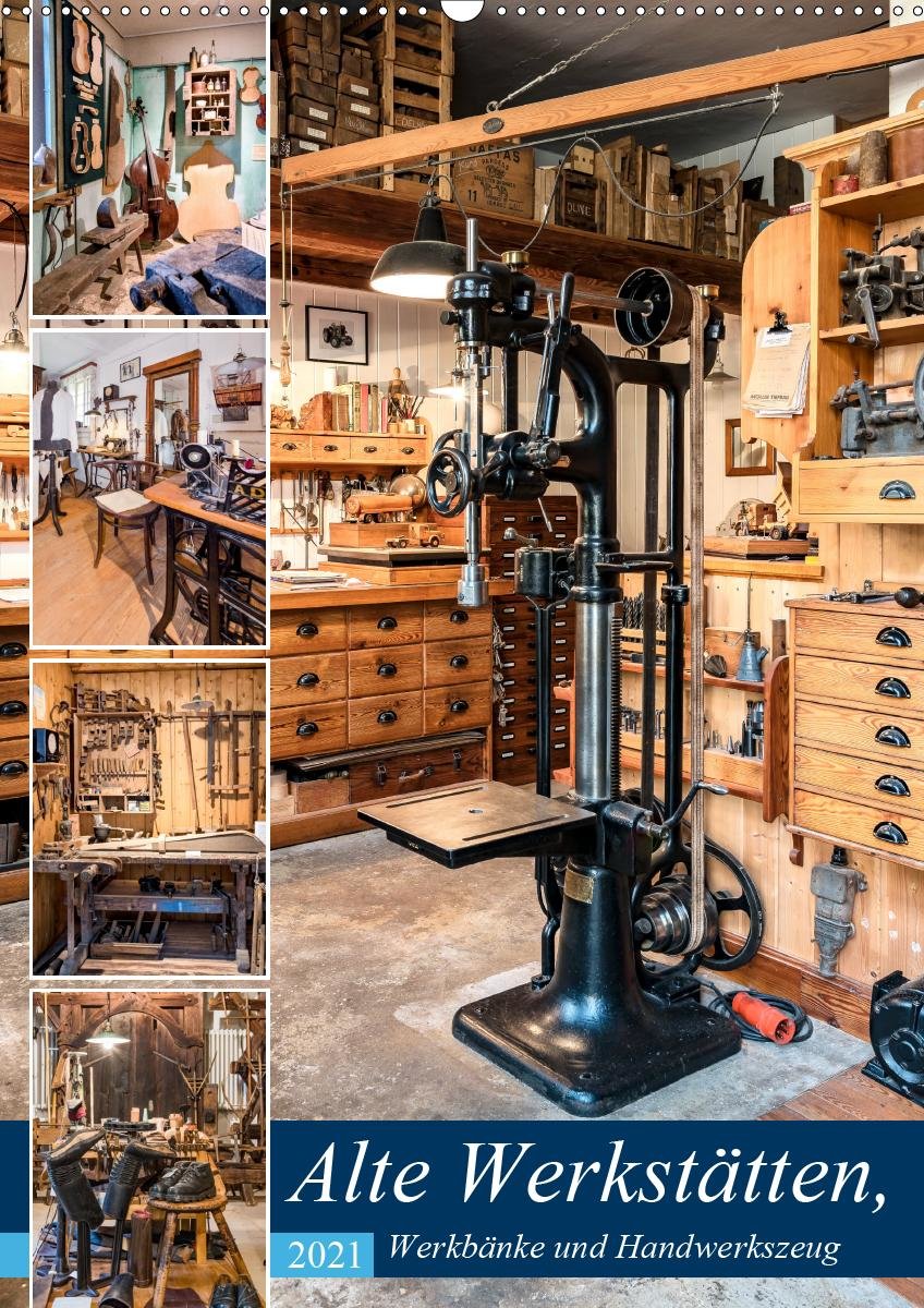 Alte Werkstätten, Werkbänke und Handwerkszeug (Wandkalender 2021 DIN A2 hoch) (německy)