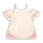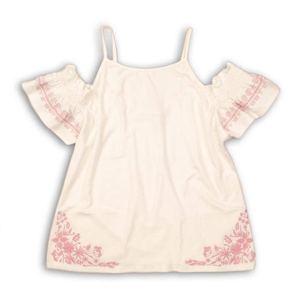 Dívčí bílá bavlněná halenka s růžovými nášivkami. Halenka je na ramínka se spadlými rukávy.  číst celé