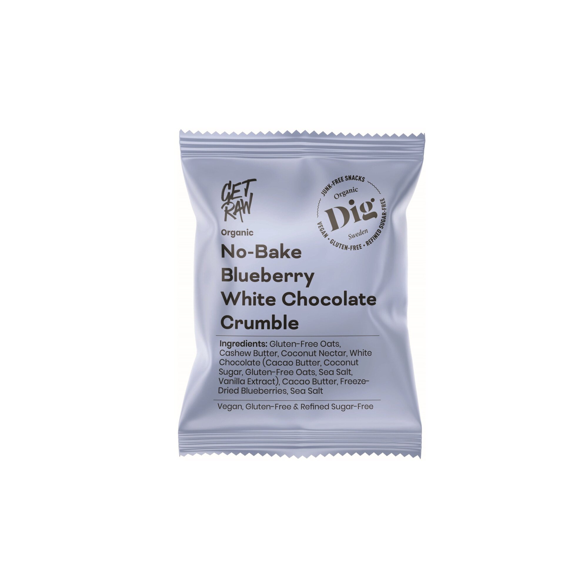 Bezlepkové OVESNÉ vločky, KEŠU máslo, kokosový sirup, bílá čokoláda 6 % (kakaové máslo, kokosový cukr, bezlepkovÁ OVESNÁ mouka, mořská sůl, vanilkový extrakt, obsah kakaa 40 %), kakaové máslo, lyofilizované borůvky 4 %, mořská sůl. Může obsahovat stopy dalších skořápkových plodů a sezamu....