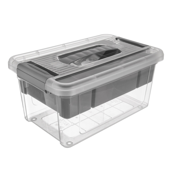 Tento průhledný úložný box disponuje víčkem se dvěma pevnými klipy, které zajistí bezpečné zavření a ochranu obsahu před prachem nebo nečistotami. Je navíc stohovatelný, což šetří místo a usnadňuje skladování více boxů najednou. Uvnitř najdete vyjímatelný vklad s přihrádkami, který oceníte při organizaci menších předmětů, ať už jde o šicí potřeby, kosmetiku nebo drobné nářadí.