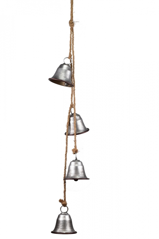 Čtyři kovové zvonky na jutovém provaze.Materiál: kov, jutaRozměry:délka celkem 75 cmvýška zvonku včetně očka na zavěšení 8 cmprůměr 7,3 cm číst celé