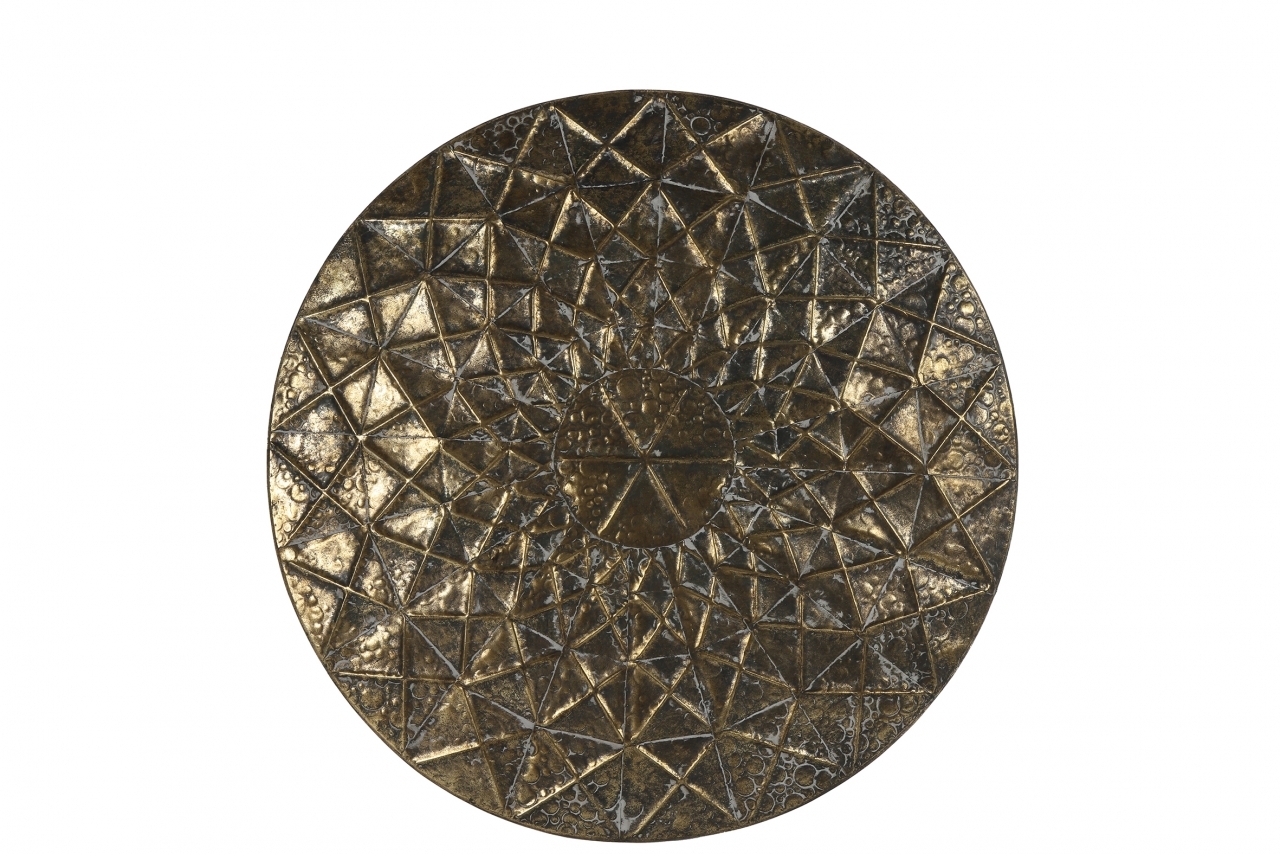 Zlatá nástěnná dekorace - štít 52 cmprůměr: 52 cmbarva: zlatámateriál: niklštít má speciální vzorování, které připomíná mandaluplastické zobrazení do prostoru Přiveďte do vašeho domova nádech luxusu a sofistikovanosti s naší zlatou nástěnnou dekorací.Díky svému elegantnímu designu a zlaté barvě... číst celé