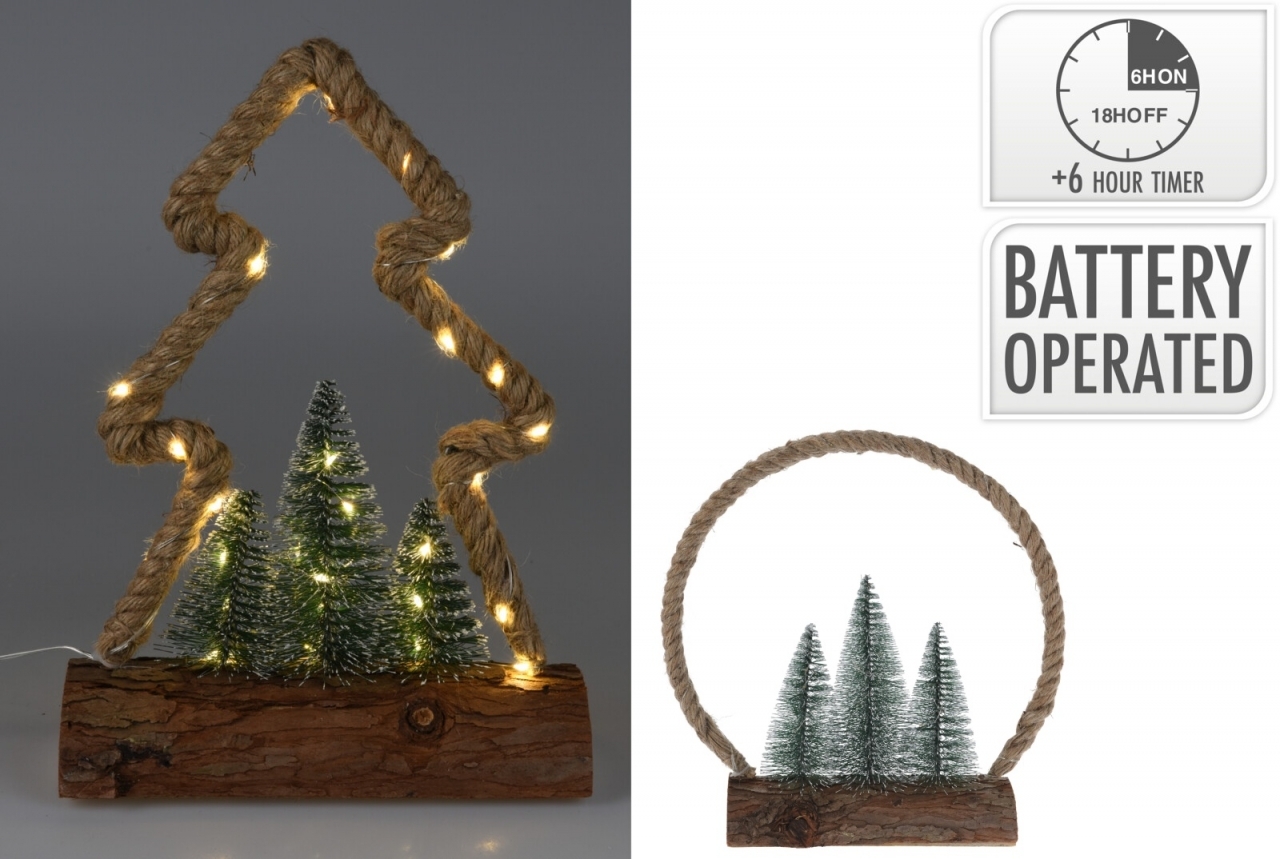 Jutový kruh s LED diodami na dřevěné podložce. Uvnitř jutového kruhu jsou menší plastové stromečky s LED diodami. Celkově 30 LED diod teplé bílé barvy. Napájení 3x AA tužkovými bateriemi (nejsou součástí výrobku). Součástí je časovač 6/18h. Délka přívodového kabelu 30 cm.Materiál: kovová...