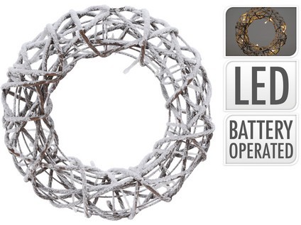 dekorace VĚNEC 30cm, RATAN/PP HN se sněhem, 15LED