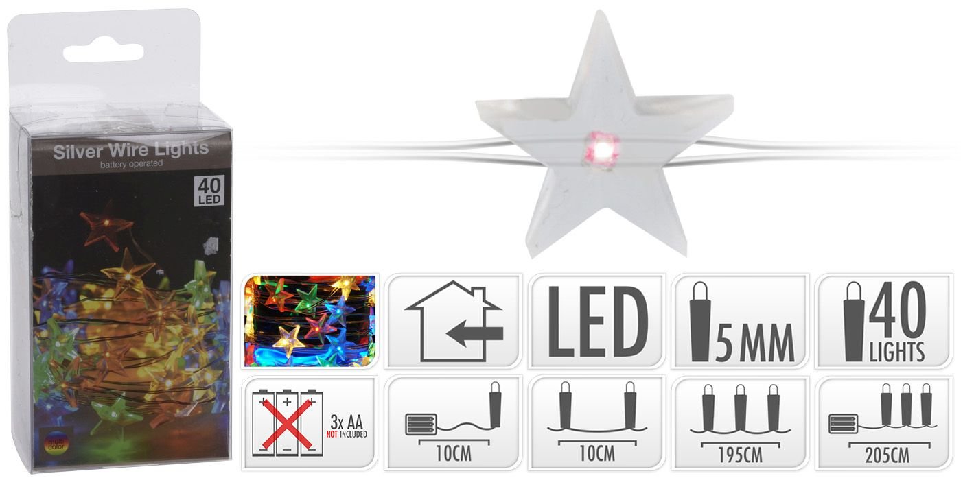 Vánoční světýlka - 40 LED žárovek v hvězdičkách. Barva žárovek - barevné. Pro vnitřní použití. Rozměry - délka 205 cm (195 cm kabel se žárovkami + 10 cm přívodní kabel), průměr hvězdiček 1 cm. Baterie - 3x AA 1,5 V (nejsou součástí balení). číst celé