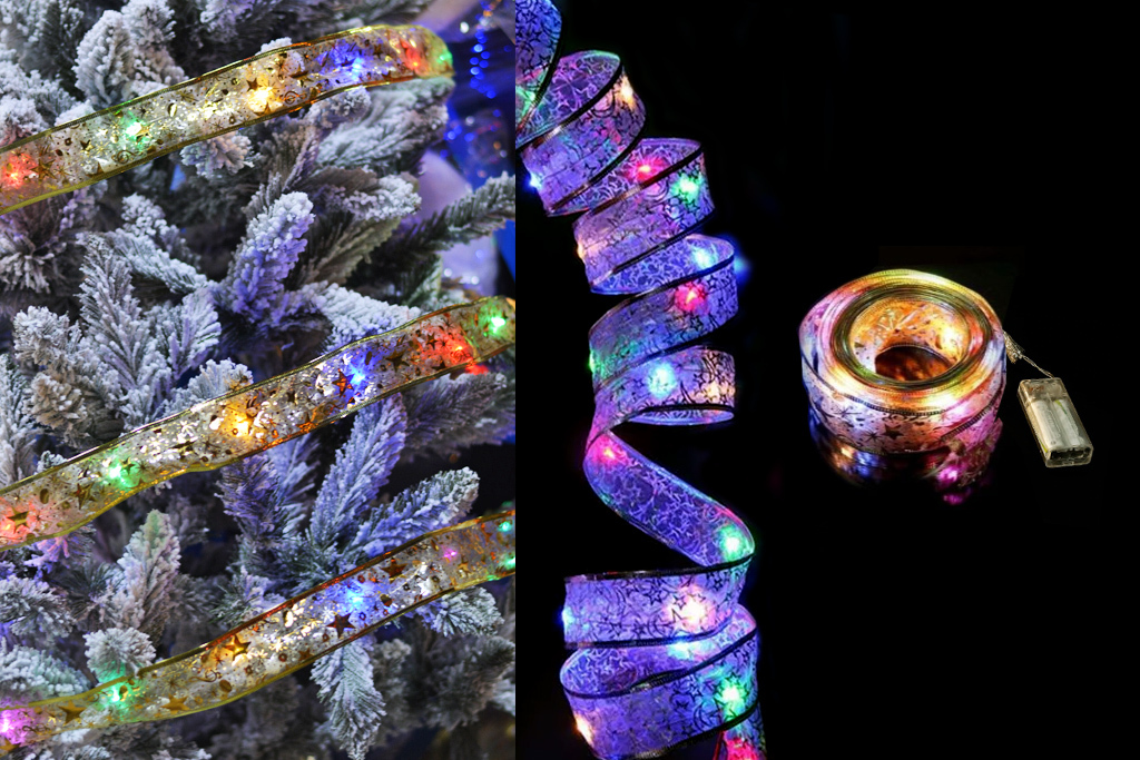 Vánoční dekorační stuha s LED osvětlením na baterie Led osvětlení na baterie. Pro vnitřní použití. Interiérová LED světla. Délka: 200cm Šířka: 5cm Napájeno 2xAA baterií (není součástí) číst celé