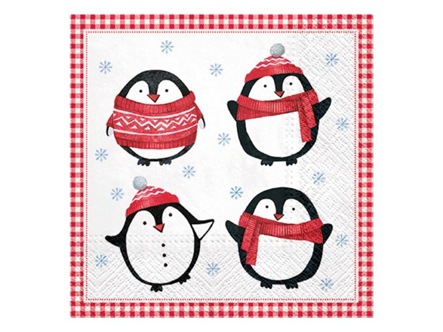 Papírový vánoční ubrousek. Ubrousek je velice kvalitní z třívrstvého papíru s motivem vánočních tučňáků. Vytvořeni decentní vánoční atmosféry stojí na maličkostech. I taková drobnost, jako vánoční ubrousky změní ráz vašeho stolování.