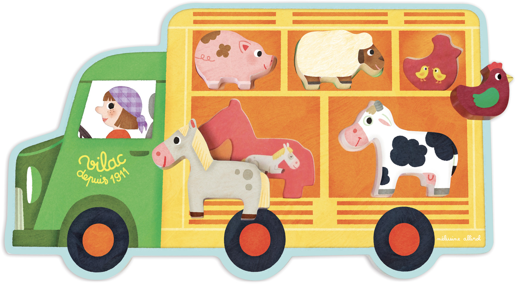 Dřevěné vkládací puzzle farmářský vůz se zvířátky. Hračky Vilac mají značku francouzské agentury ADEME, to znamená, že tyto dřevěné hračky jsou vyráběny ekologicky. Šetří životní prostředí, neznečišťují půdu, vodu a vzduch, neplýtvají energiemi.Již více než 100 let plní značka Vilac dětské sny....