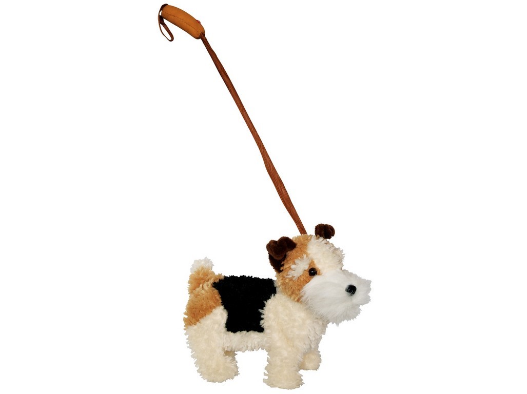 Pes foxteriér s vodítkem, vesele štěká a chodí, 30cm
