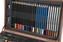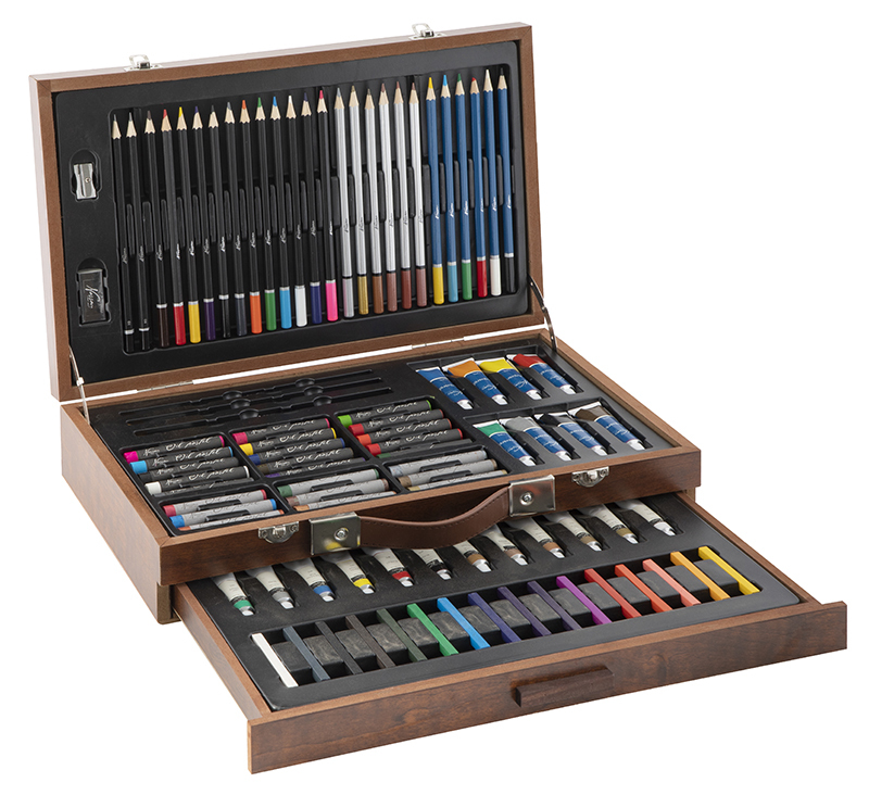 Tato kompletní sada obsahuje celkem 112 kusů malířských potřeb, které zahrnují barevné křídy, pastelky, barvy, ořezávátko, gumu a štětce. Vše je uloženo v pevně zpracovaném dřevěném rozkládacím kufříku, který umožňuje snadný přístup k jednotlivým pomůckám a zároveň krásně vypadá.