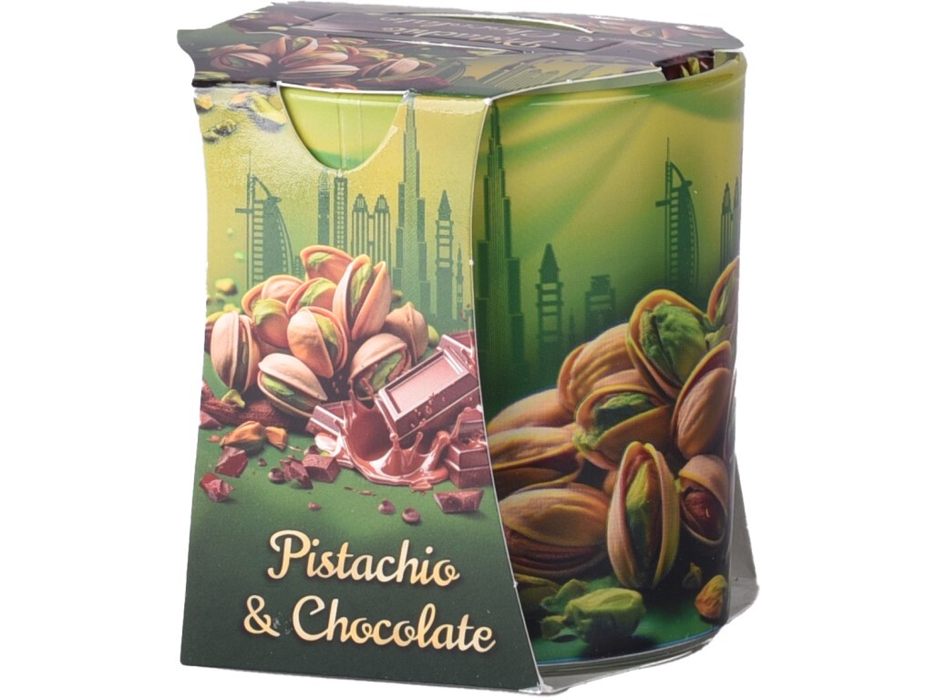 Vonná svíčka ve skle potažená fólií s dekorativním potiskem pistácií a čokolády, určená jako dekorace do bytu nebo jako dárek. Obsahuje éterické oleje a je vybavena knotem, který udržuje plamen stabilní. Voní po pistáciích s jemnou čokoládovou vůní, působí hřejivě a lahodně. Hmotnost náplně: 80...