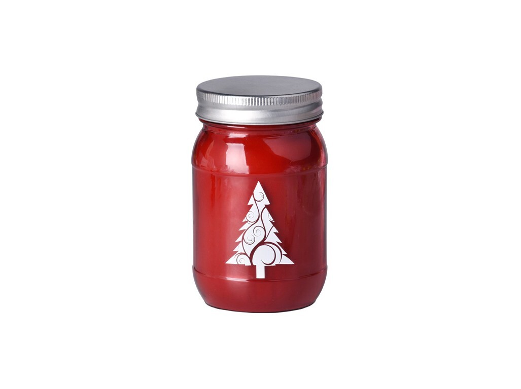 Emocio Sklo 70x120 mm s plechovým víčkem Baked Cinnamon Roll, potisk stromek, červená vonná svíčka