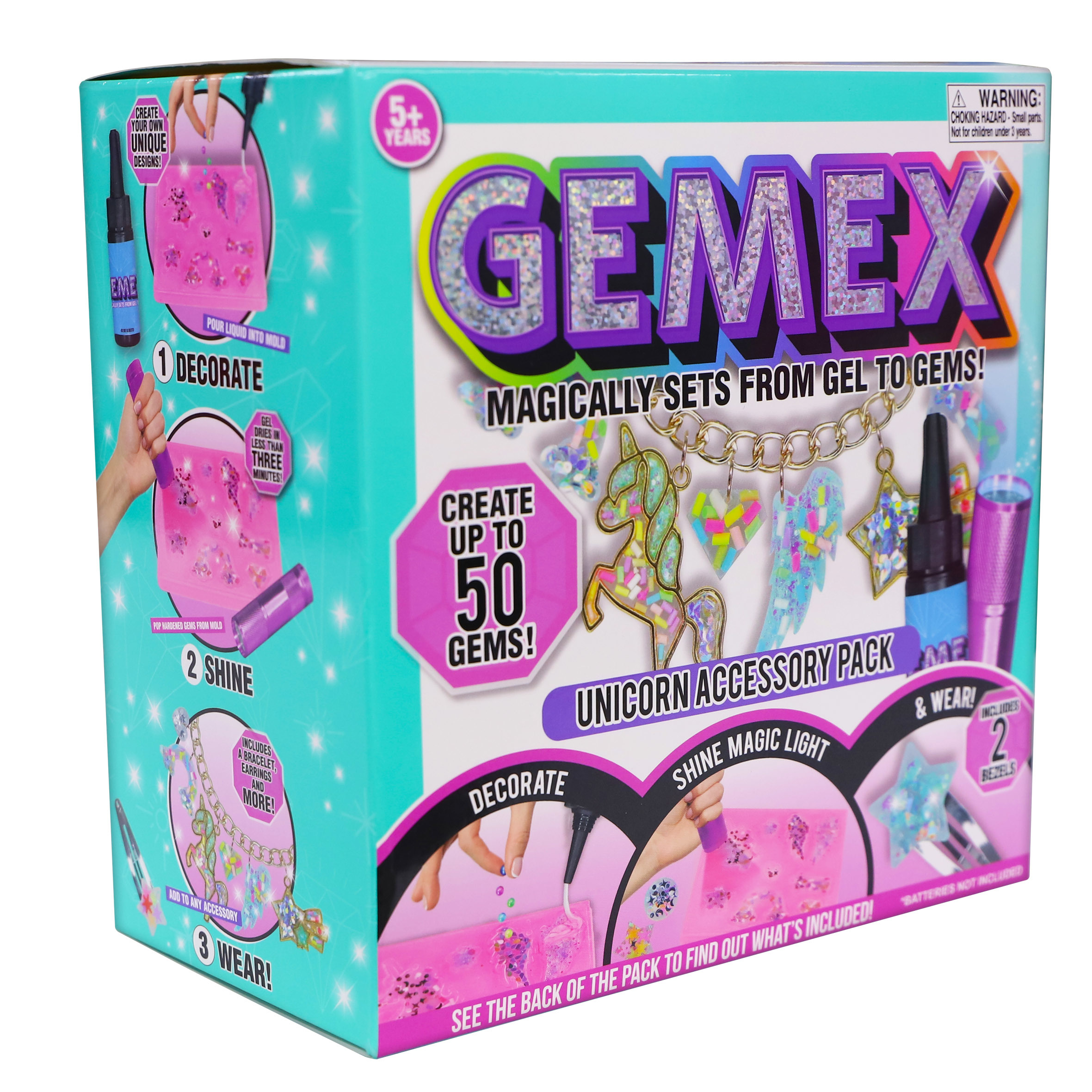 Gemex, to je kouzlo zrozené přímo před vašima očima! Vyrobte si spoustu skvělých drahokamů na téma "jednorožec"! Jednoduše přidejte ozdoby, lesk a můžete nosit svůj Gemex výtvor během několika minut. Nalijte gel do formy, přidejte ozdoby a sviťte na formu kouzelnou svítilnou po dobu 3 - 5 minut....