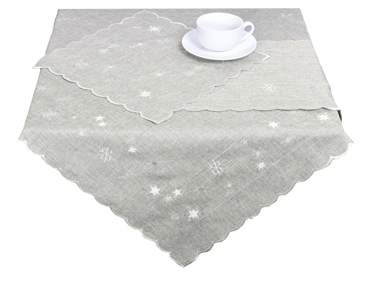 Ubrus Vánoční, Stříbrné vločky a stříbrno bílé hvězdičky, šedý 35 x 35 cm