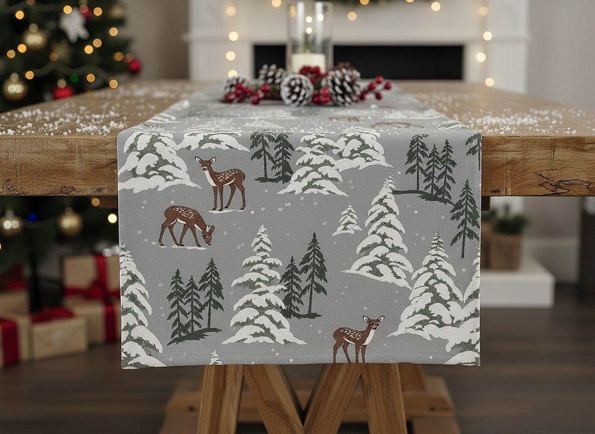 Vánoční ubrus - běhoun na stůl BRIGHT TWIGS šedá 35x180 cm