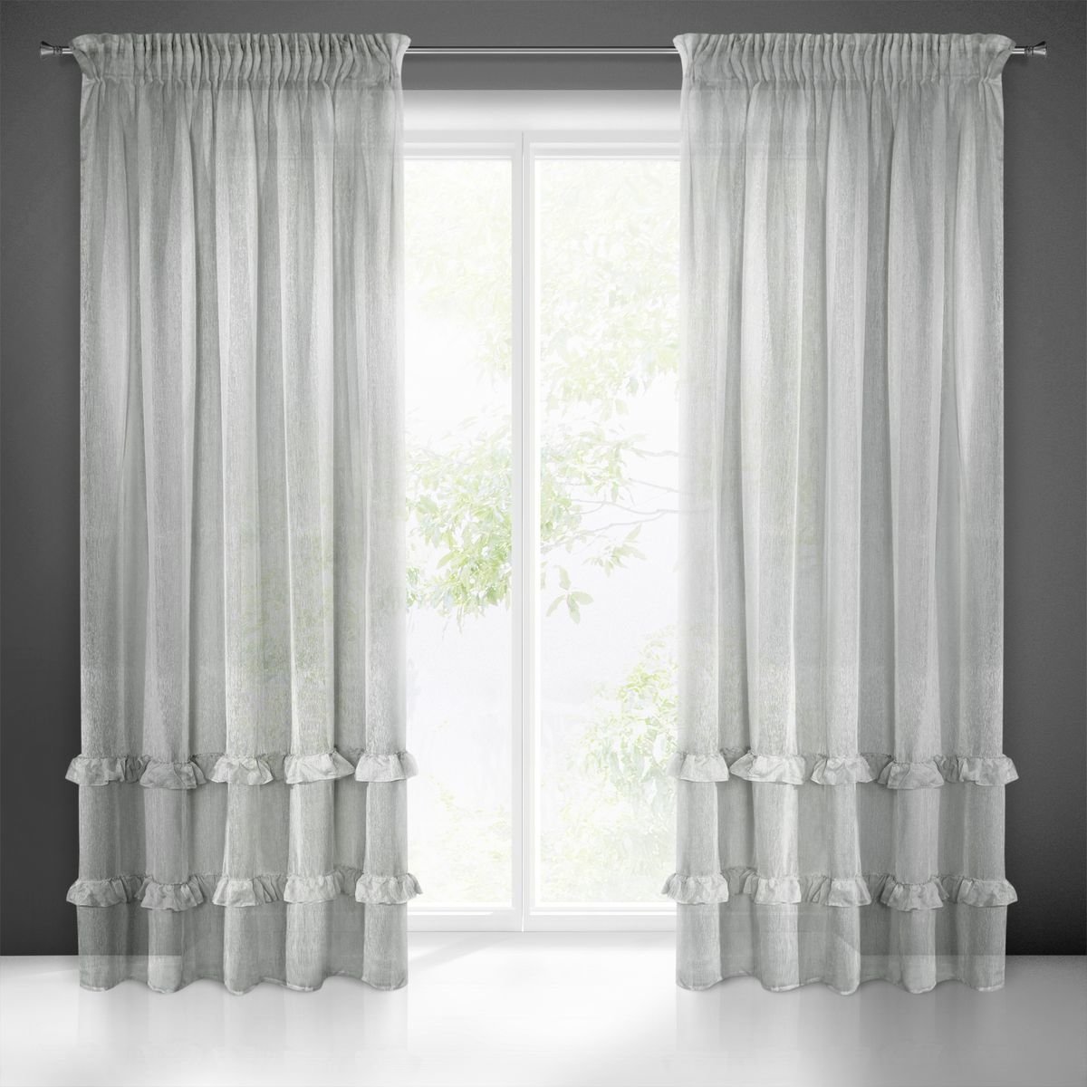 Dekorační záclona LORYNA s ozdobnými volánky s řasící páskou šedá 140x270 cm (cena za 1 kus) MyBestHome