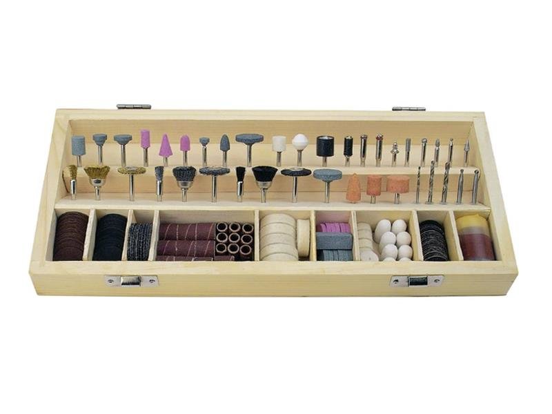 200 dílů pro nejdůležitější brousící, řezací, vrtací, frézovací a leštící práce. Průměr dříku je 3,2 mm
