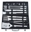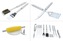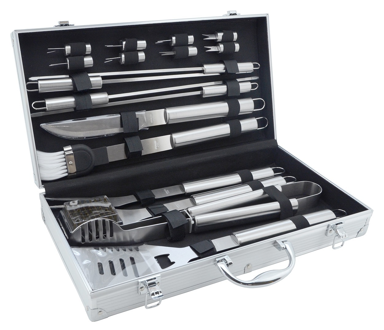 Obracečka délky 44 cm, s precizně broušenou hranou, vybavená zoubkovaným ostřím, otvírákem zátek a otvory pro odtok. Kleště, speciálně tvarované pro jistý úchop nejrůznějších pokrmů, délky 43 cm. Kartáč délky 42 cm pro údržbu grilu, kdy samotná kartáčová část z mosazi má rozměry 7 x 5,5 cm. Nepostradatelnou částí grilovacího nářadí je i dvouzubá vidlička délky 43,5 cm. Štětec délky 44 cm se 4,5 cm štětinami z nylonu, pro potírání, či mašlování pokrmů. Porcovací nůž délky 42 cm, kde ostří je délky 16 cm. 4x grilovací jehlice celkové délky 42 cm, kde na pokrmy lze využít celých 30 cm, hroty jehlic jsou broušené do špičky. Poslední součástí nářadí je 8x napichovátko délky 7 cm, určené pro držení kukuřice.