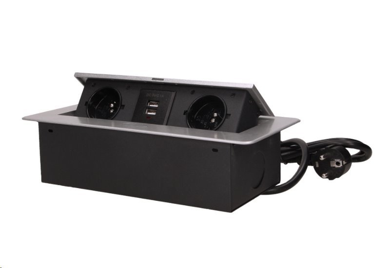 Zásuvka vestavná ORNO OR-AE-13126/G výklopnáVýklopný zásuvkový blok ve stříbrné barvě určený pro vnitřní instalaci do stolů, stolních desek, pracovních desek v kuchyni, kanceláři jak ve vertikálním tak i horizontálním směru. Výklopná část obsahuje 2 síťové zásuvky 230V se zemnícím kolíkem a 2x...