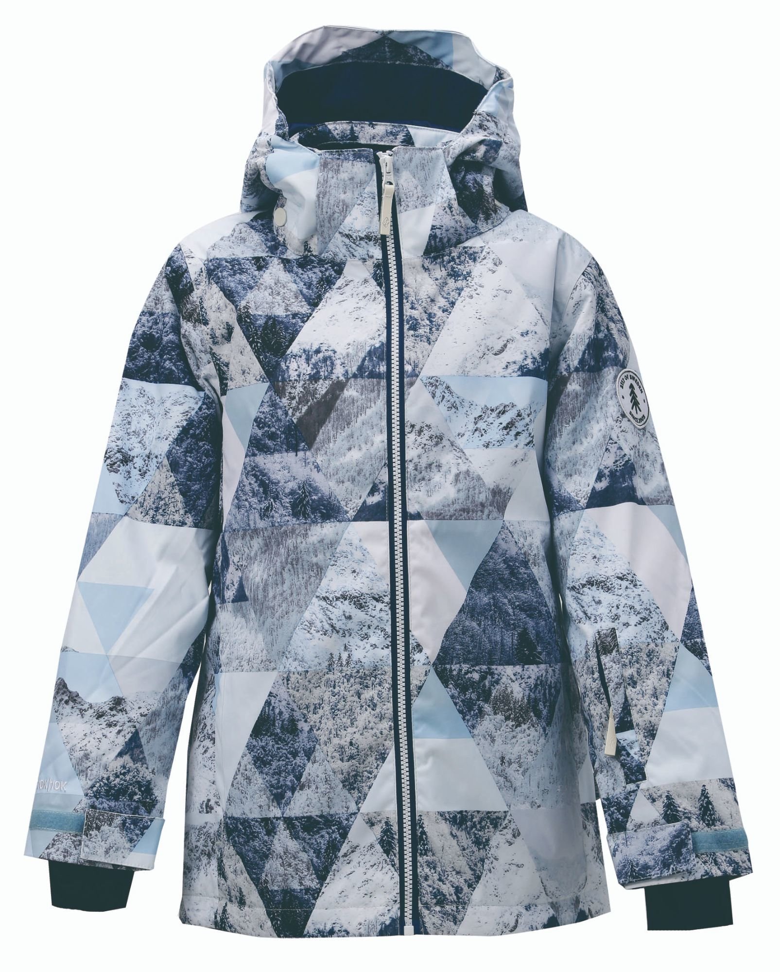 TÄLLBERG - midi dětská zimní bunda s odnímatelnou kapucí, AOP (potisk hor) - 116