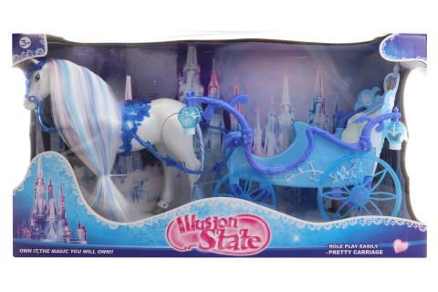 - Pohyblivý koník s modrým kočárem s hudebními a světelnými efekty.
